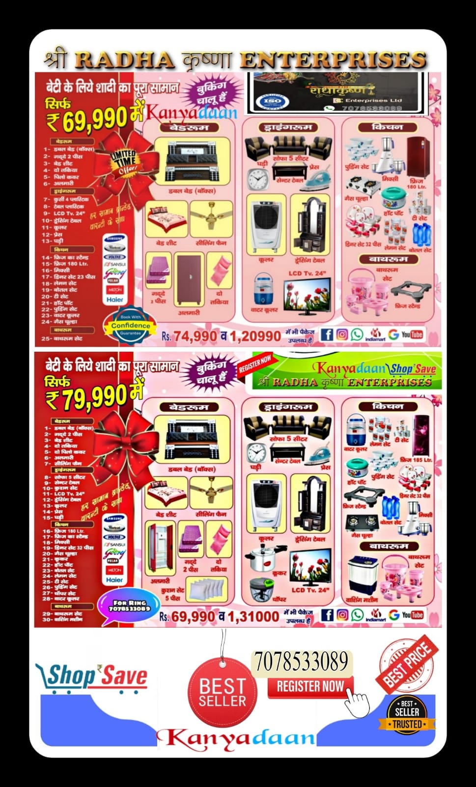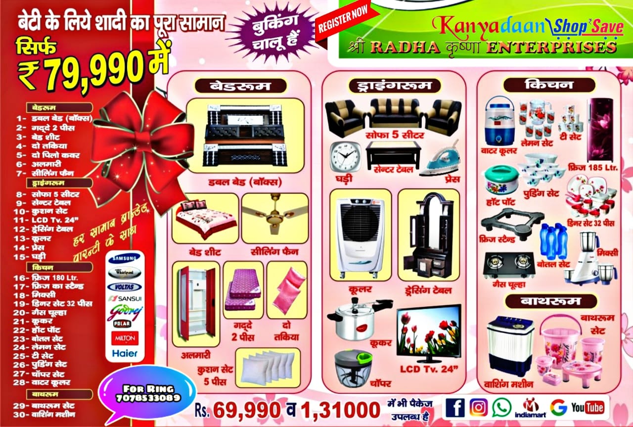 Begin A New Journey With The Name You Can trust Shri Radha Krishna Enterprises, First Time In Dibiyapur श्री Radha कृष्णा Enterprises brings for you (KANYADAN PACKAGE) कन्यादान पैकेज, Kanyadan exemplifies the bond between a Father and Daughter and their mutual love श्री Radha कृष्णा Enterprises also cherish this bond and offer you the most affordable KANYADAN.PACKAGE . Where You Can get #Fridge, #LED 32"#Cooler 3'f #Double bed# Almirah with mirror# the matress 4" #Chair #JMG #pillow#dressing Table करे एक नई शुरुआत / श्री Radha कृष्णा Enterprises ke saath लाड़ली बिटिया की गृहस्थी में निपटाऊ नहीं टिकाऊ फर्नीचर दे All under one package