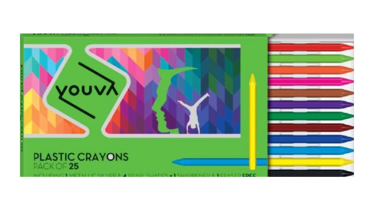Youva Plastic Crayons Premium - Pack of 25 pcs, Length 100mm (Free Eraser & Sharpener
